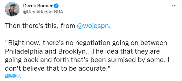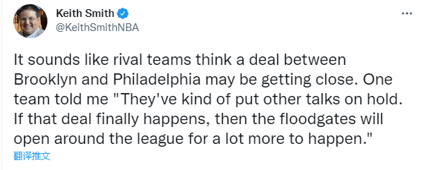 名记Keith Smith透露,对手球队认为篮网与76人间的交易正接近达成。