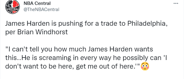 名记Brian Windhorst透露哈登正推动被交易到费城:我无法告知你哈登有多想交易的发生,他以各种可能的方式尖叫‘我不想在这里,让我离开这里。