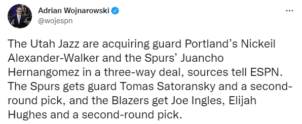 来源:JRS直播网02-10 18:02JRS直播网02月10日讯 ,NBA又有一笔大交易达成,据ESPN名记沃纳罗斯基报道,爵士、马刺和开拓者达成一笔三方涉及多人大交易,具体的交易细节是爵士得到亚历山大-沃克、胡安-埃尔南戈麦斯;马刺得到萨托兰斯基和一个次轮选秀权;开拓者得到英格尔斯、伊莱亚-休斯和一个次轮选秀权。