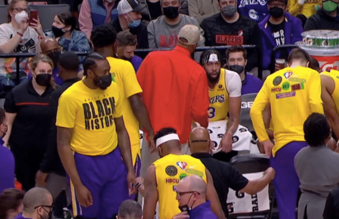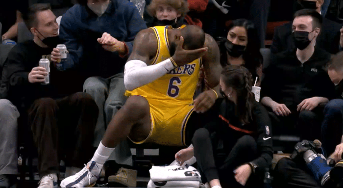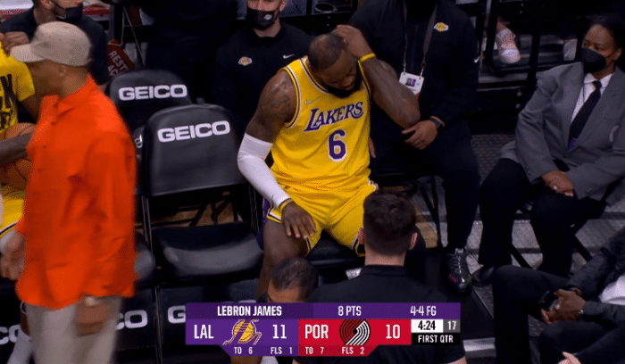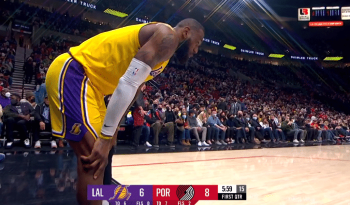 第一节6分多钟,詹姆斯背打麦克勒莫,突然转身加速杀到禁区,上篮时被开拓者球员麦克勒莫打到脑袋,之后詹姆斯捂着脑袋十分痛苦,走到场边顺势坐在观众席,见状球迷赶紧让开并且挤作一团,换了一会后,詹姆斯站起来,继续留在场上比赛,身体无碍。