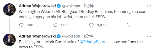 来源:JRS直播网02-09 12:29JRS直播网02月09日讯 ,据ESPN名记沃纳罗斯基报道,奇才球星布拉德利-比尔计划接受左手腕舟月韧带撕裂修复手术,预计将会赛季报销,比尔的经纪人已经证实了这一消息。