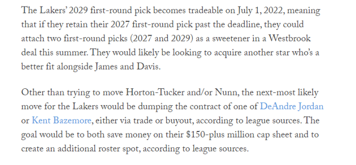 名记分析,若湖人想在交易截止日前达成一笔交易,他们很可能送走霍顿-塔克或者纳恩,除此之外,湖人可能清理掉小乔丹和贝兹莫尔的合同(交易或者买断),如此一来,湖人可以节省薪金空间并且多腾出一个阵容名额。