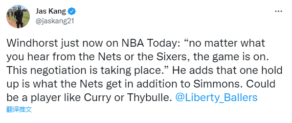 据名记Brian Windhorst曝光,篮网和76人正在进行关于哈登的交易谈判,并且除了本-西蒙斯外,篮网还有可能从76人得到赛斯-库里或塞布尔这样的球员。