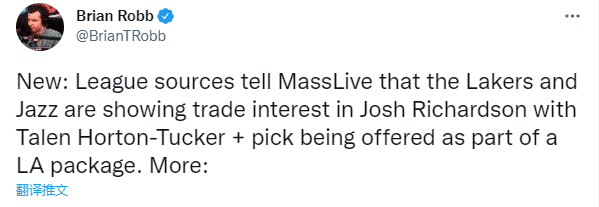 约什-理查德森、特伦斯-罗斯和米尔萨普都是湖人潜在的引援目标,NBA记者Brian Robb报道,湖人已经用霍顿-塔克和一个未来首轮签报价约什-理查德森。