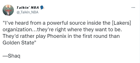 争议!奥尼尔爆料:湖人满意排名,想在季后赛首轮打太阳而不想打勇士