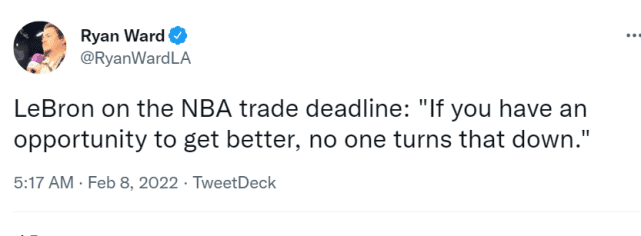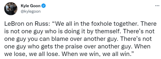 此前有报道称,湖人仍尝试送走威少,但可能性极低。在今天训练结束后,詹姆斯接受采访,力挺威少。谈到近来状态低迷的威少,他说:“我们都在一条战壕里,没有一个人是独立存在的。 没有一个人可以责怪另一个人,也没有一个人比另一个人更该得到称赞。 当我们输了,我们都输了。 当我们赢了,我们都赢了。”不过,詹姆斯谈到截止日时也表示,如果球队能通过交易变得更好,没有人会拒绝。