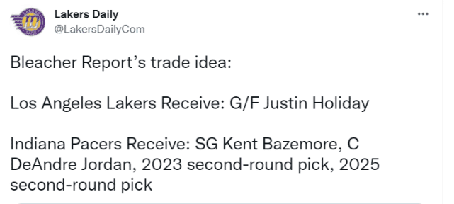 这笔交易方案是湖人送走贝兹莫尔、小乔丹、2023年次轮签和2025年次轮签,得到步行者的贾斯汀-霍乐迪。B/R指出,湖人已经用塔克+纳恩+2027年首轮签询价了多支球队,但反应平淡,他们可能无法用这个筹码组合换来所需的球员。