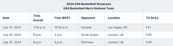 美国男篮还宣布,作为美国篮球备战奥运会的一部分,美国男篮将在拉斯维加斯举办训练营,7月11日在这里和加拿大男篮打一场热身赛,7月21日在伦敦对阵南苏丹以及7月23日对阵德国男篮。