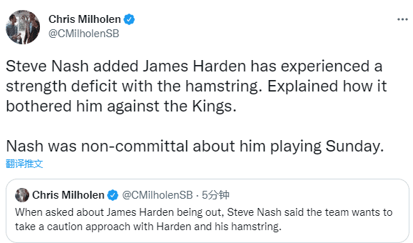 谈到哈登因伤休战,纳什表示球队希望对哈登的腿筋伤势采取谨慎的态度:詹姆斯-哈登的腿筋出现了力量不足的情况,这让他在上一场对阵国王时感到困扰,今晚让哈登休战的决定是为了预防,我们想再给他几天时间,以确保他的腿筋感觉好一些。;纳什还表示希望哈登下一场能上场。