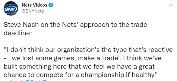 谈到交易截止日的交易流言,纳什认为球队不会仅仅因为他们输了就做出交易,我认为我们在这里建立了一些东西,我们觉得如果健康的话,我们有很大的机会夺得总冠军。