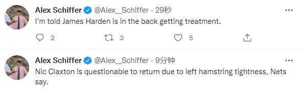哈登随队前往盐湖城,并且赛前来到球场,为何没有现身替补席?篮网记者Alex Schiffer表示,哈登只是在后边接受治疗。