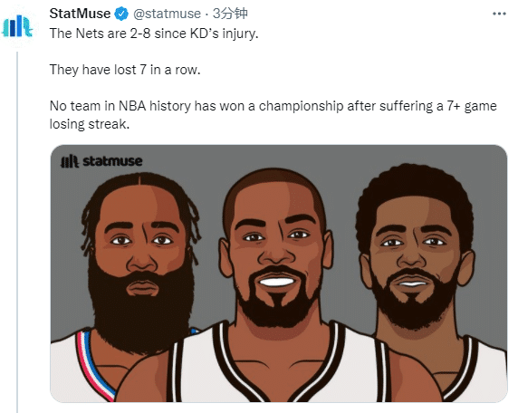 自从杜兰特受伤后,篮网2胜8负,据美媒统计,NBA历史上没有一支球队在遭遇7连败后赢得总冠军。