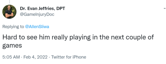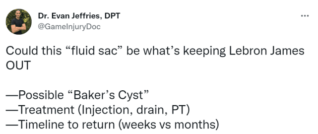医学专家Evan Jeffries昨天晒出了詹姆斯的一个起跳视频,显示他的左膝后侧可能存在一个液囊。今天,Evan Jeffries再次更新社媒,认为很难看到詹姆斯在未来几场比赛中回归。他还写道:“这个液囊会不会是让詹姆斯伤停的原因?可能是贝克氏囊肿。治疗方案包括注射、引流和理疗,回归的时间可能是数周,甚至是数月。”