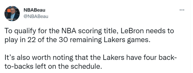 詹姆斯的得分王评选资格悬了!他需要在余下30场打至少22场,而余下赛程有4个背靠背。