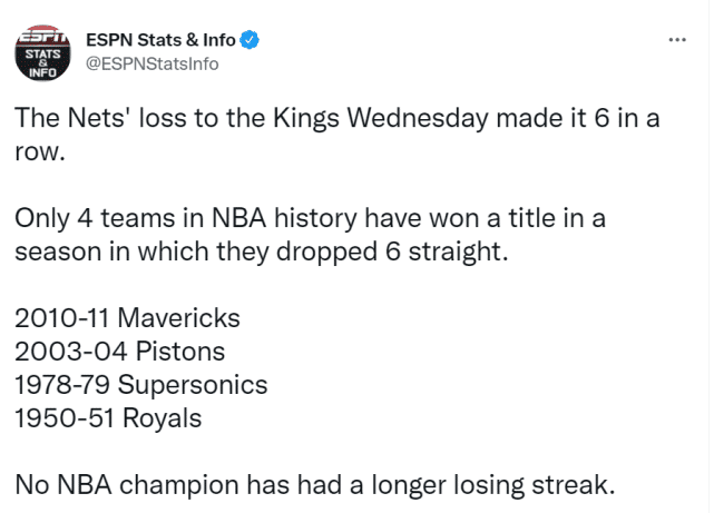 篮网6连败还能夺冠吗?NBA史上只有4队做到过!美媒:夺冠概率5%