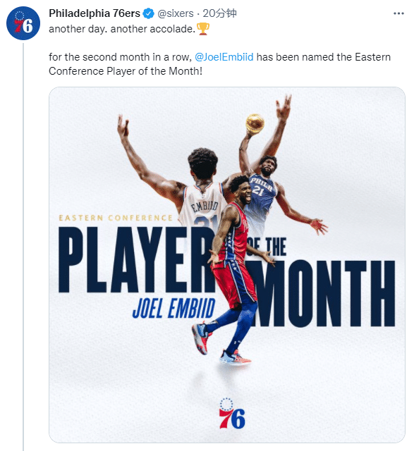 76人官方第一时间恭喜恩比德,发推晒照并且写道:另一天,另一个荣誉。