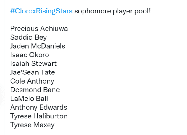 二年级球员(12人):阿丘瓦(猛龙)、贝(活塞)、麦克丹尼尔斯(森林狼)、奥科罗(骑士)、斯图尔特(活塞)、泰特(火箭)、科尔-安东尼(魔术)、贝恩(灰熊)、三球(黄蜂)、爱德华兹(森林狼)、哈利伯顿(国王)、马克西(76人)。