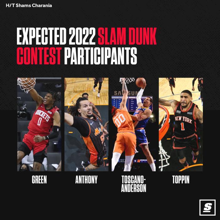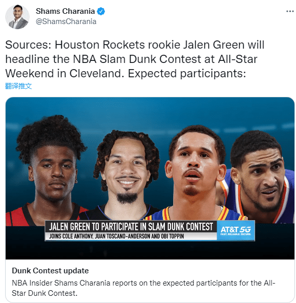 来源:JRS直播网02-02 11:31JRS直播网02月02日讯 ,NBA2022年全明星周末扣篮大赛名单曝光,据名记Shams报道,消息人士透露,火箭新秀杰伦-格林、魔术球员科尔-安东尼、勇士球员托斯卡诺-安德森和尼克斯球员托平(第二次参加),预计他们将参加2022年克利夫兰全明星赛扣篮大赛。