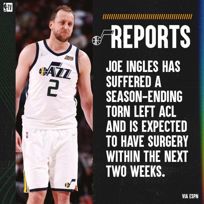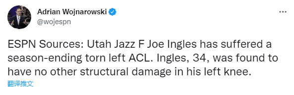来源:JRS直播网02-01 12:50JRS直播网02月01日讯 ,爵士主力英格尔斯的核磁结果出炉,据ESPN名记沃纳罗斯基报道,英格尔斯遭遇左膝十字韧带撕裂的重伤,赛季报销提前告别本赛季;但好在膝盖其他部位没有更多损伤。