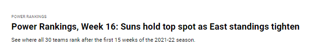 NBA官方最新实力榜!太阳第1勇士第3,篮网排名再降湖人第20位