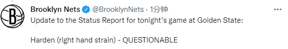 篮网官宣!哈登右手扭伤又添新伤,战勇士出战成疑杜兰特缺席