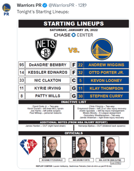 勇士对阵篮网的首发五虎是库里、汤普森、维金斯、卢尼和奥托-波特,库里继续首发出战,生涯第808场常规赛,超越勇士名宿穆林成为队史上场次数最多的球员,该纪录队史第一人;库里出场数还超越名帅“禅师”菲尔-杰克逊升到历史第405位。