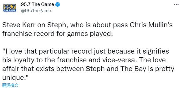 对于库里打破队史出场纪录,赛前勇士主帅科尔表示:我喜欢这个特殊的纪录,因为他代表了球员对于球队的忠诚,反之亦然,库里和湾区之间的感情是非常独特的。