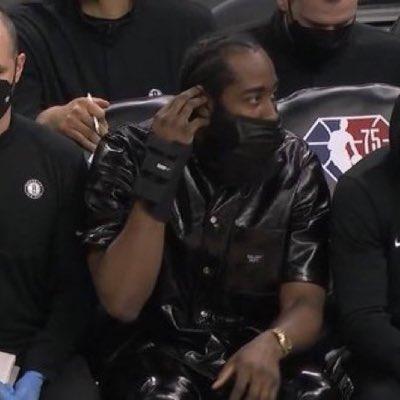 哈登右手上佩戴护具,坐在场边观战,身穿一套黑色皮衣,还戴着大金表,更是做了一个粉丝的美甲,如此打扮十分抢镜。