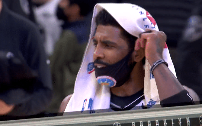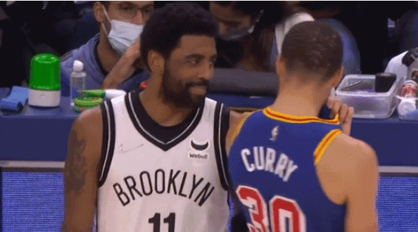 哈登戴护具观战!勇网两大巨星说悄悄话,库里衣领捂嘴,欧文笑着盯着他