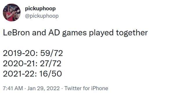 受困于伤病,詹眉同场的场数近年下滑。第一个赛季,72场比赛,两人59场同场。第二个赛季,72场比赛,两人只有27场同场,本赛季已经打了50场,两人同场也只有16场。