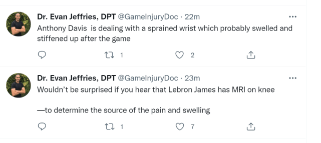 在上一场比赛中,浓眉扣篮时手腕扭伤,Evan表示他很可能要面对手腕肿胀和僵硬的情况,休息一场也不奇怪。威少和布拉德利能够出场,但两人的状态也不是100%,威少右膝酸痛,属于带伤出战,赛季至今,他一场没休息,真正的铁人。布拉德利受到胃病困扰,不过看来症状不是特别严重,他也能打。