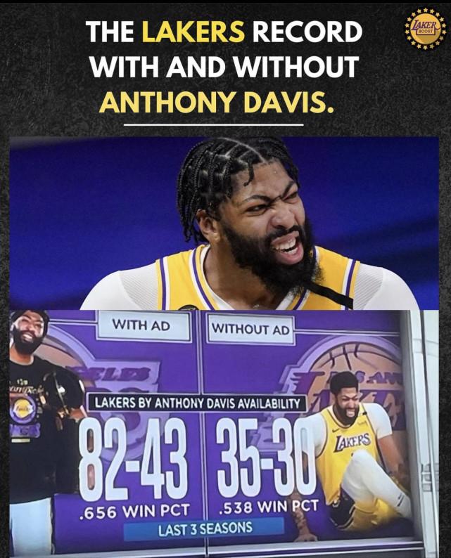 湖人没有詹姆斯和浓眉,胜率会有怎样的变化?赛前,美媒已经用数据给出答案。过去3个赛季,浓眉出战的比赛,湖人82胜43负,胜率65.6%,而浓眉休战的比赛,湖人35胜30负,胜率变成53.8%。