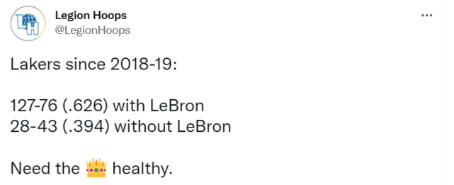 詹姆斯缺席对湖人的胜率影响就更大了,自从2018-19赛季加盟湖人以来,詹姆斯上场的比赛,湖人127胜76负,胜率62.6%,而詹姆斯休战的比赛,湖人28胜43负,胜率只有39.4%。他们需要健康的詹姆斯。