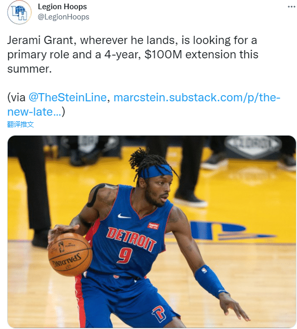 今年休赛期,无论留在活塞还是加盟其他球队,格兰特都想要新签一份至少4年1亿美元的合同。