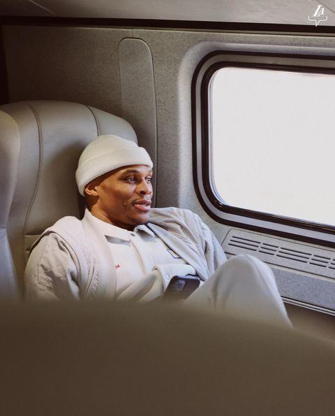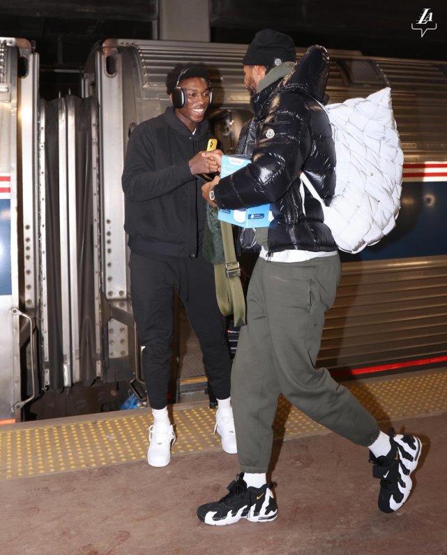 湖人官方还晒出了湖人前往费城参赛的照片,从布鲁克林到费城只有150多公里,这一回他们的交通工具不是飞机,而是火车。詹姆斯一手拿着手机,一手握着瓶水,冲着镜头做鬼脸。浓眉则玩着笔记本,威少一脸平静。