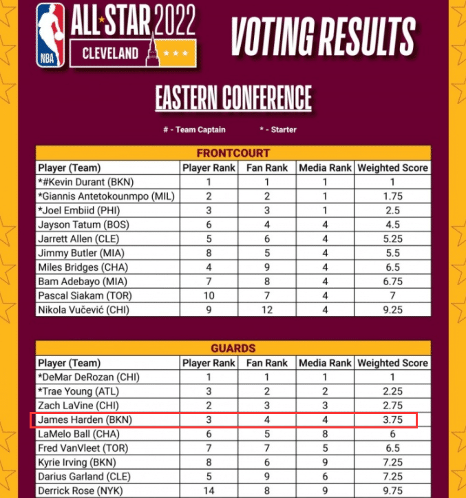 太惨了!全明星票选哈登仅东部后场第4,投奔篮网后四大皆空