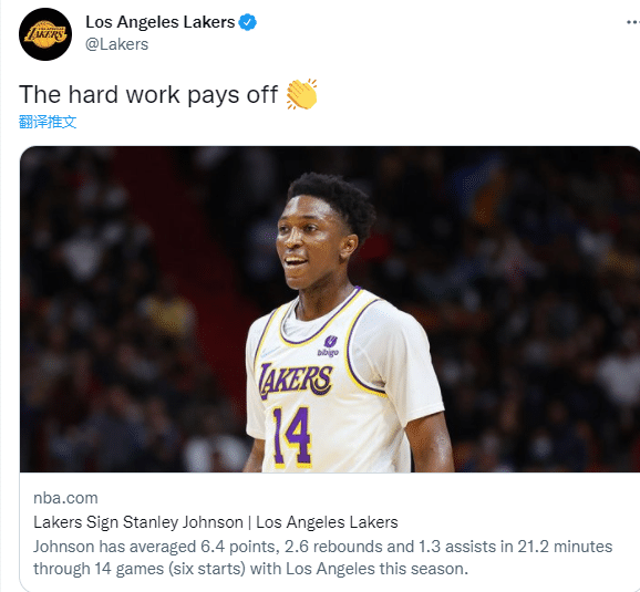 顺便提一下,湖人官方已经宣布续签斯坦利-约翰逊,双方新签2年合同;约翰逊2年合同金额是324万美元,下赛季是球队选项;本赛季,约翰逊为湖人出战14场比赛(首发6场),场均21.2分钟贡献6.4分2.6篮板1.3助攻0.8抢断0.4盖帽。