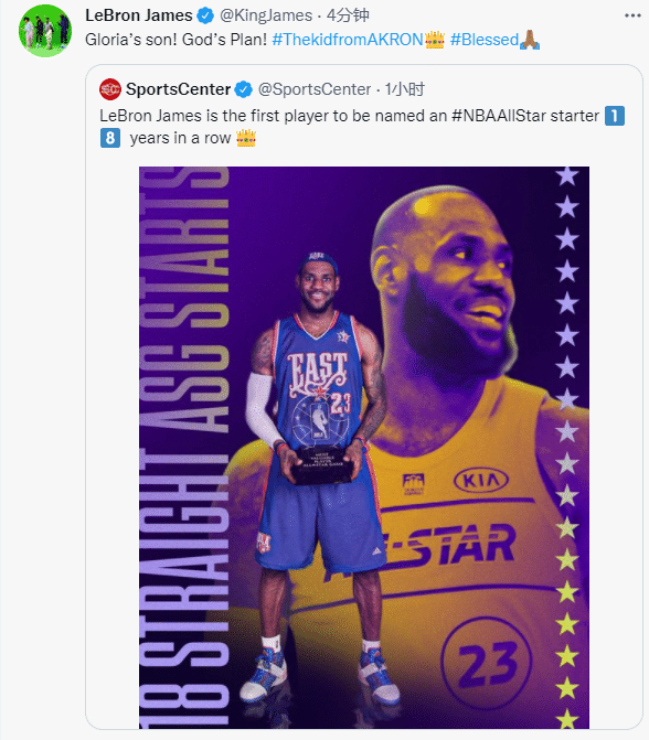 老詹回应入选全明星首发,发推写道:格洛里亚的儿子,上帝的计划#来自阿克伦的孩子(王冠)