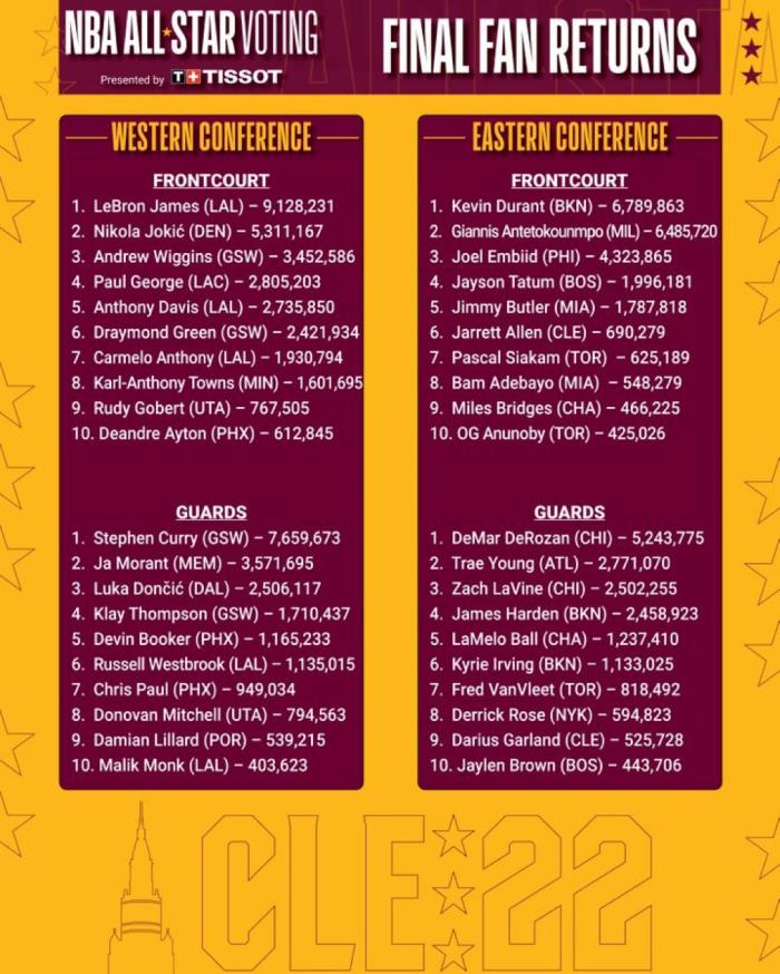 来源:JRS直播网01-28 10:44JRS直播网01月28日讯 ,NBA 2022年全明星球迷投票的最终结果出炉,湖人巨星詹姆斯9128231完胜库里和杜兰特再次当选全明星票王;詹姆斯18次全明星9次票王以及5次队长,票数再创历史新高,9次票王追平乔丹并列历史第一。