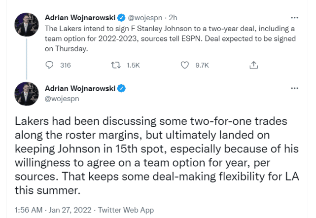 沃纳罗斯基报道称,湖人一直在讨论一些二换一的交易方案,但最终还是让约翰逊留下,成为队内的第15人。特别是约翰逊愿意接受明年合同为球队选项,让双方很快达成协议,这为湖人今年夏天的运作保留了一些交易的灵活性。