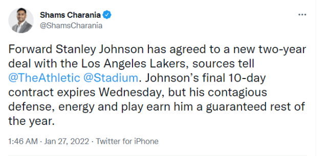 来源:JRS直播网01-27 16:43JRS直播网01月27日讯 ,据ESPN名记沃纳罗斯基报道,湖人决定和前锋斯坦利-约翰逊签下一份两年合同,这份合同的2022-23赛季为球队选项。此前,约翰逊和湖人签过3份10天短合同。双方预计在北京时间周五正式签下这份两年合同。