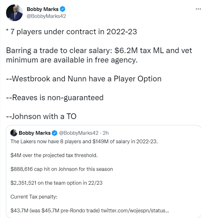 马克斯还透露了湖人这两年的薪金状况。目前他们面临的奢侈税是4370万美元,在交易朗多前是4570万美元。到了2022-23赛季,湖人有7名球员在合同期,总薪金已经达到1.49亿美元。