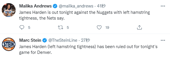 篮网官宣最新伤情,哈登因伤休战!杜兰特欧文在列全队8人缺战掘金