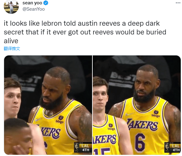 美记者Sean yoo调侃:看起来勒布朗告诉了奥斯汀-里夫斯一个黑暗的秘密,如果它泄露出去,里夫斯就要遭殃了。