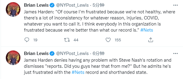 哈登还表示他只是对球队因伤病而战绩不理想而感到沮丧:当然,我很沮丧,因为很多原因,伤病、疫情,或者你想怎么叫它们都行;我们队里的每个人都很沮丧,因为我们有能力获得比现有战绩更棒的成绩。我们应该继续前进,事情就是这样。