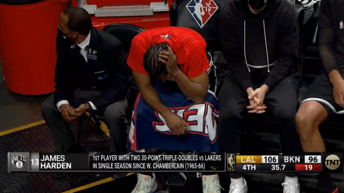 末节还剩2分多钟,纳什早早换下哈登,之后哈登坐回替补席,垂头丧气十分无助,一脸沮丧。