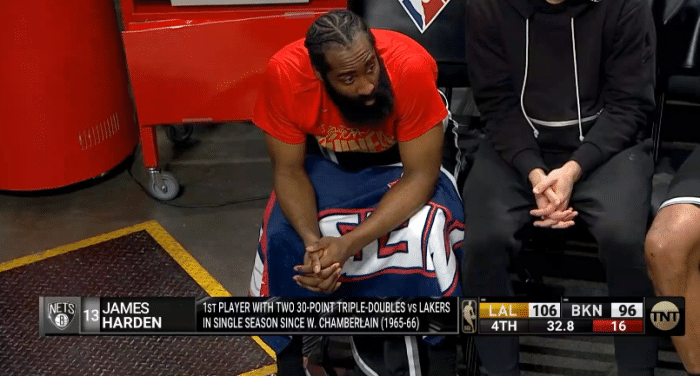 来源:JRS直播网01-26 11:51JRS直播网01月26日讯 ,篮网主场96-106不敌湖人,杜兰特和欧文双双缺阵,哈登单核带队大战湖人三巨头太无奈,全场出战38分钟24投11中、三分7中2拿到33分12篮板11助攻2抢断1盖帽;哈登又轰下30+三双仍输球,比赛早早失去悬念,提前下场放弃比赛。