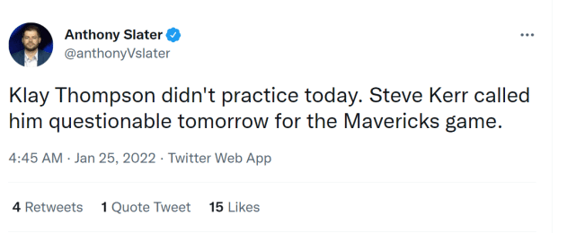 来源:JRS直播网01-25 11:30JRS直播网01月25日讯 ,勇士队进行训练,备战明天主场对独行侠的比赛。膝盖酸痛的克莱-汤普森并没有参加今天的训练,勇士主帅科尔表示,汤普森明天上场的状态是questionable(出战成疑,上场可能50%)。上一场对爵士的比赛,汤普森就因膝盖酸痛缺阵。