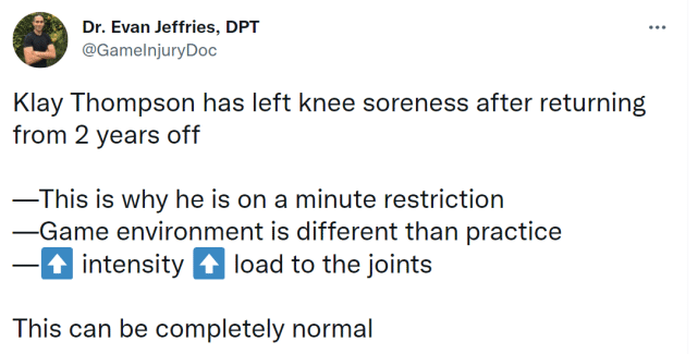 两大医学专家也就汤普森的膝盖酸痛问题进行解析。医学专家Evan Jeffries写道:“在缺阵两年后,汤普森回归后出现左膝酸痛的现象。这就是为什么他需要有上场时间限制的原因。比赛的环境毕竟和训练不一样,强度上升,也会作用于关节。这(膝盖酸痛)是完全正常的反应。”