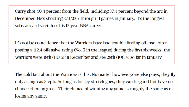 数据显示,勇士在本赛季前6周的进攻效率是112.4排在联盟2。12月,勇士进攻效率110.5排在联盟第18,而一月至今,勇士只有106.4排在联盟第28位。勇士在10月和11月的20场比赛得分全部超过100分,而12月和1月的27场比赛有9场得分没有过百。